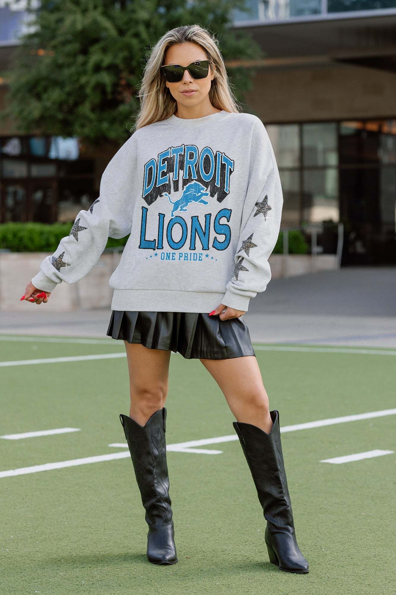 Elevate gameday with our Detroit Lions drop shoulder, long sleeve fleece pullover adorned with rhinestud stars on the sleeves. Shine brightly and show your Detroit Lions pride.