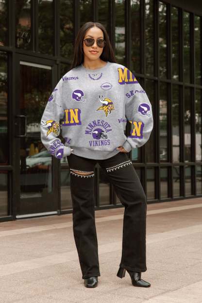 Show off your team spirit in style with this premium fleece sweatshirt featuring an eye-catching allover print of mixed Minnesota Vikings logos and mascots. Designed with a relaxed fit and drop shoulders for that effortlessly cool, oversized look, this fan-favorite sweatshirt combines comfort and team pride. Whether you're heading to the game, running errands, or lounging at home, this officially licensed piece is the perfect blend of cozy and spirited—made to be worn on repeat.