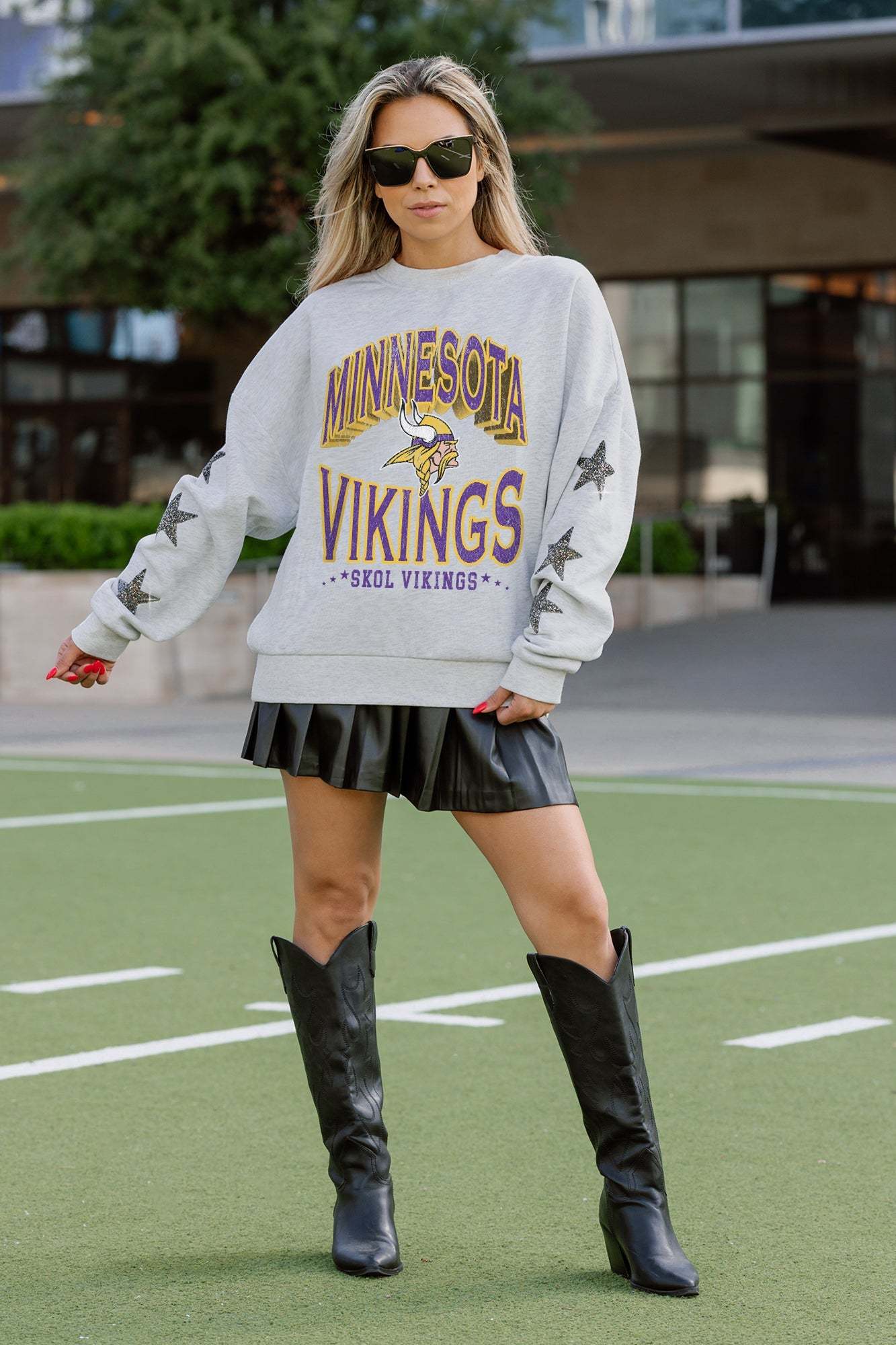 Elevate gameday with our Minnesota Vikings drop shoulder, long sleeve fleece pullover adorned with rhinestud stars on the sleeves. Shine brightly and show your Minnesota Vikings pride.