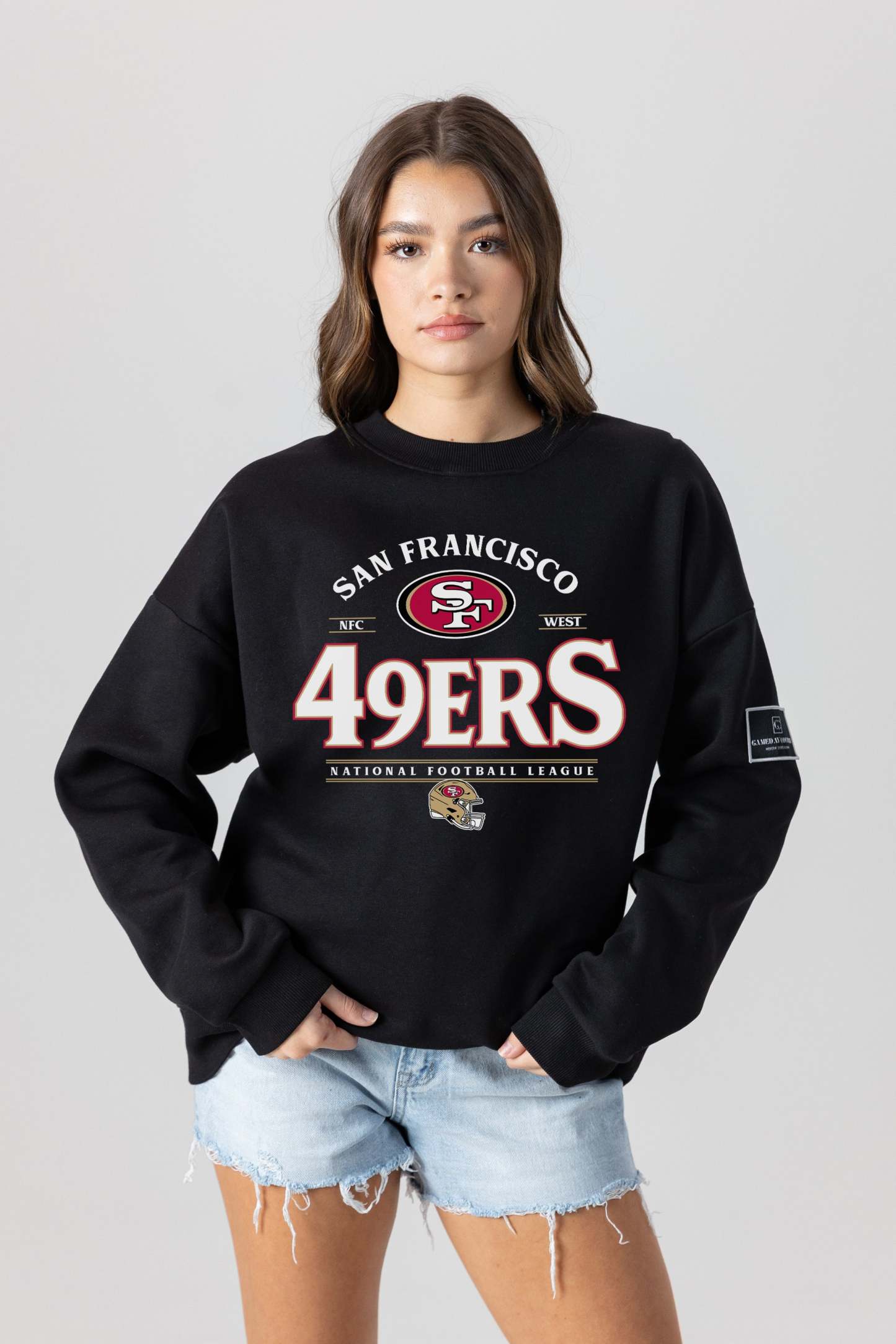 Get ready to cheer on your San Francisco 49Ers with our black label premium fleece drop-shoulder crewneck with ribbed knit neckline, cuffs, and waistband. From the game to the everyday, this is your go-to choice.