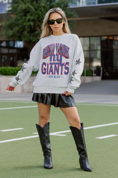 Elevate gameday with our New York Giants drop shoulder, long sleeve fleece pullover adorned with rhinestud stars on the sleeves. Shine brightly and show your New York Giants pride.