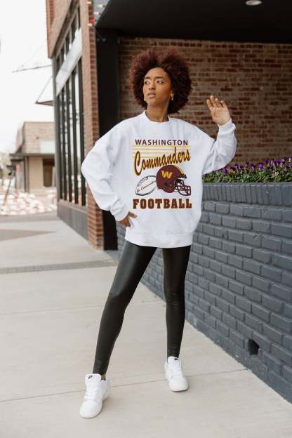 Stand out from the crowd in our Washington Commanders premium fleece long sleeve sweatshirt. Boasting an oversized fit, crewneck and ribbed knit neckline, wrists, and waistband, it effortlessly blends comfort with fashion. Show your support for your favorite school or team in this irresistibly soft sweatshirt.
