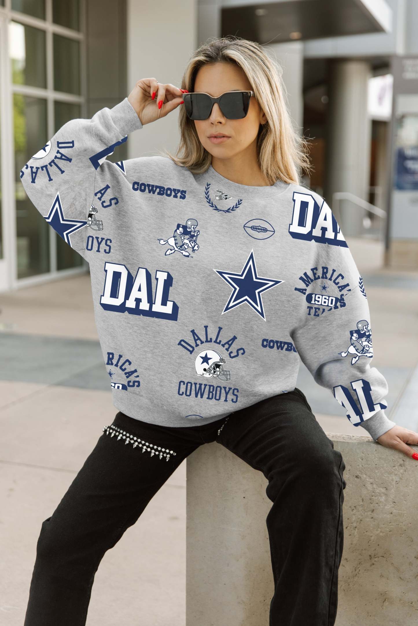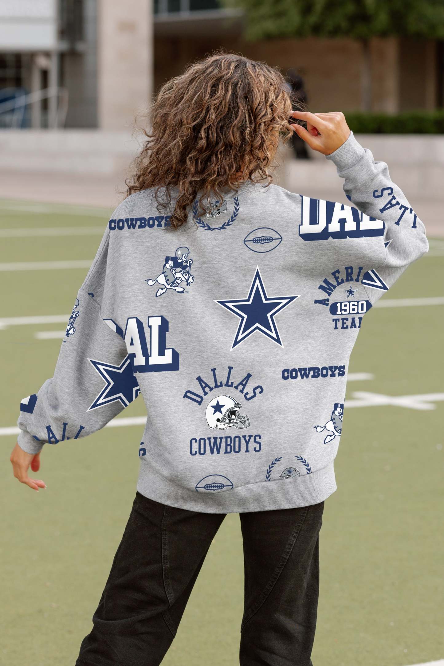 Show off your team spirit in style with this premium fleece sweatshirt featuring an eye-catching allover print of mixed Dallas Cowboys logos and mascots. Designed with a relaxed fit and drop shoulders for that effortlessly cool, oversized look, this fan-favorite sweatshirt combines comfort and team pride. Whether you're heading to the game, running errands, or lounging at home, this officially licensed piece is the perfect blend of cozy and spirited—made to be worn on repeat.