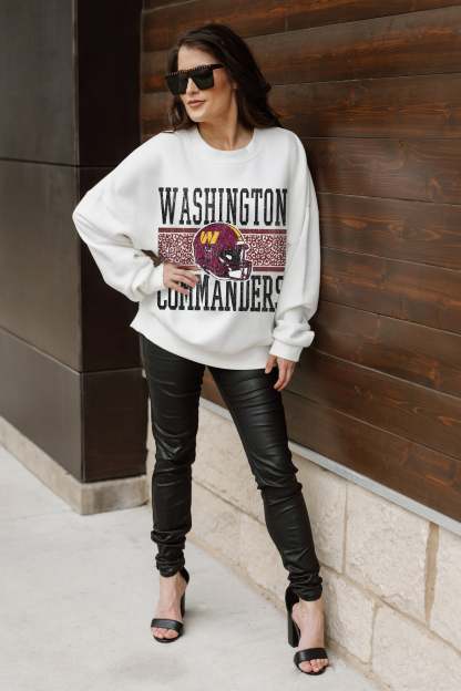 Stand out from the crowd in our Washington Commanders premium fleece long sleeve sweatshirt. Boasting an oversized fit, crewneck and ribbed knit neckline, wrists, and waistband, it effortlessly blends comfort with fashion. Show your support for your favorite school or team in this irresistibly soft sweatshirt.